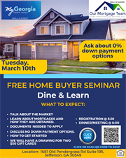 Join MyGeorgia Credit Union for a free Home Buyer Seminar designed to help you confidently take the first steps toward homeownership. This informative “Dine & Learn” event will cover everything you need to know about the home buying process, including how mortgages work, what documents are needed to apply, current housing market insights, and available loan programs, including no down payment options. Our experienced mortgage team will walk you through how to get started, answer your questions, and help you understand your options so you can move forward with confidence. Dinner will be provided, and attendees will be entered into a drawing for two $50 gift cards. Whether you are a first-time buyer or simply want to learn more about your options, this seminar is a great opportunity to gain valuable information and connect with local mortgage experts.